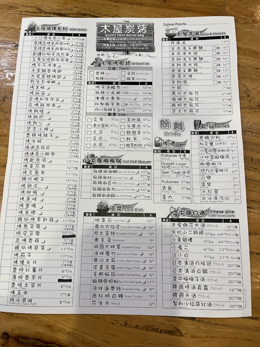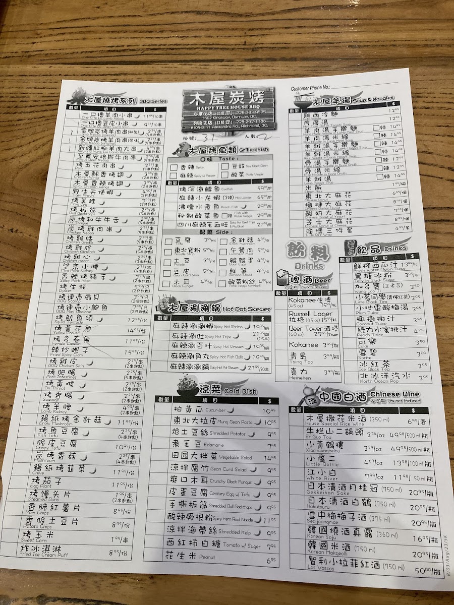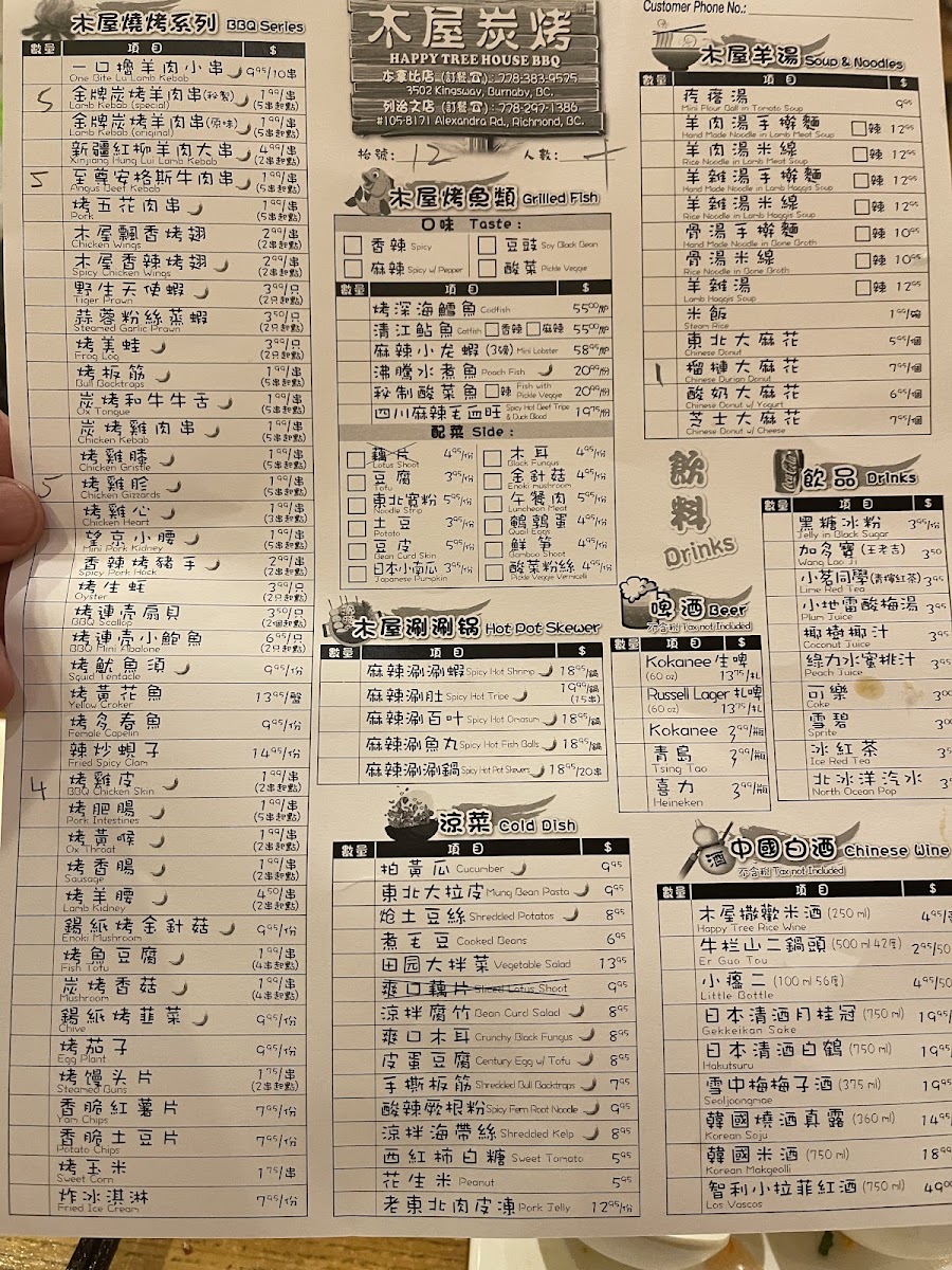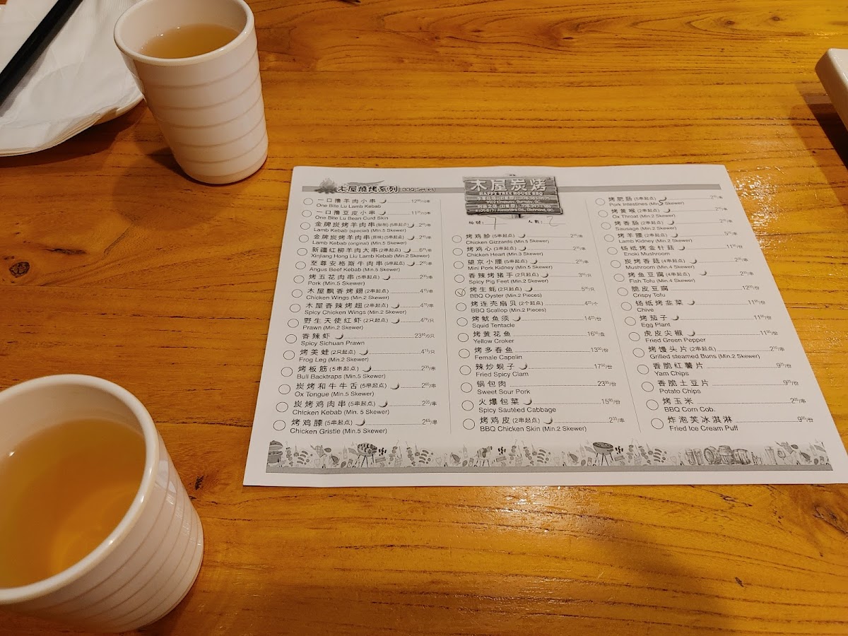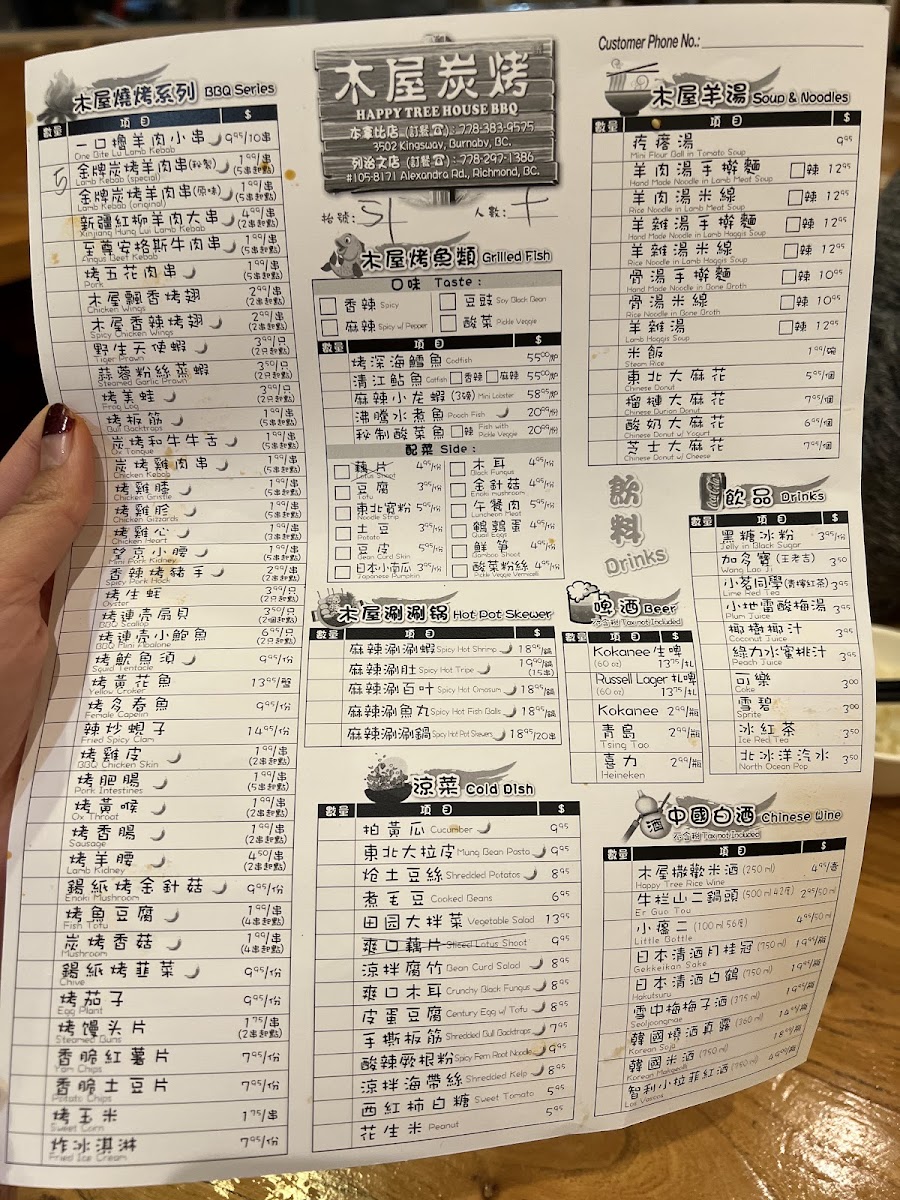 The menu at Happy Tree House BBQ Kingsway木屋炭烤(溫哥華店) features a variety of Chinese barbecue and traditional dishes, with a focus on skewered meats, spicy specialties, and hearty soups. The offerings are organized into several main categories to suit different dining preferences and group sizes.