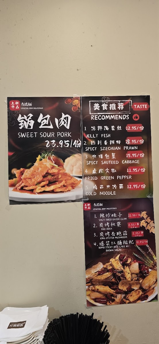 Additional Items: The menu also features side dishes such as yam chips, spicy eggplant, squid tentacles, mung bean pasta, and BBQ mini abalone. Drinks include Chinese beer such as Tsing Tao and rice wine, complemented by snacks like Chinese donut with cheese.